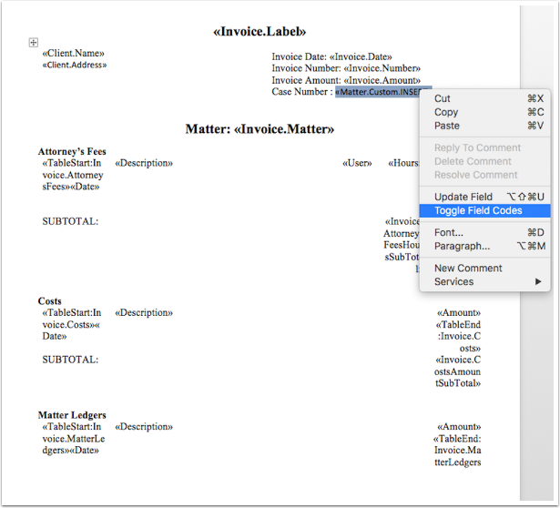 12. 'Right-click' the field and select the 'Toggle Field Codes' option.