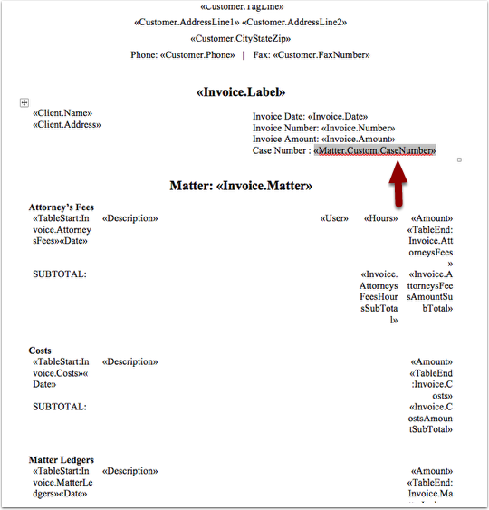 5. Select the merge field you wish to add to your Invoice Template by highlighting the merge field. Make sure to highlight from quote to quote.