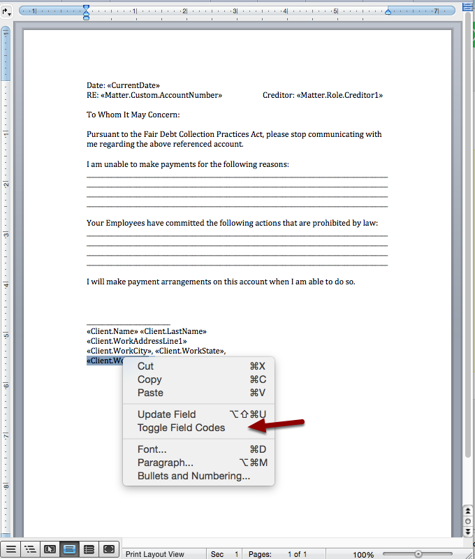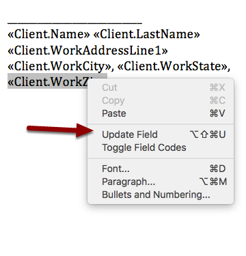 - Modify the contents of the merge field by selecting 'Toggle Field Codes' in the right-click menu. After you make changes to the field content, re-toggle your merge field by right-clicking the field, and clicking 'Update Field' again.