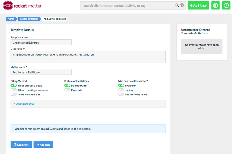 NOTE: If you choose to create a matter name for your template, this matter name will populate each time you use this template. It will override any existing matter names if applied to an existing matter.