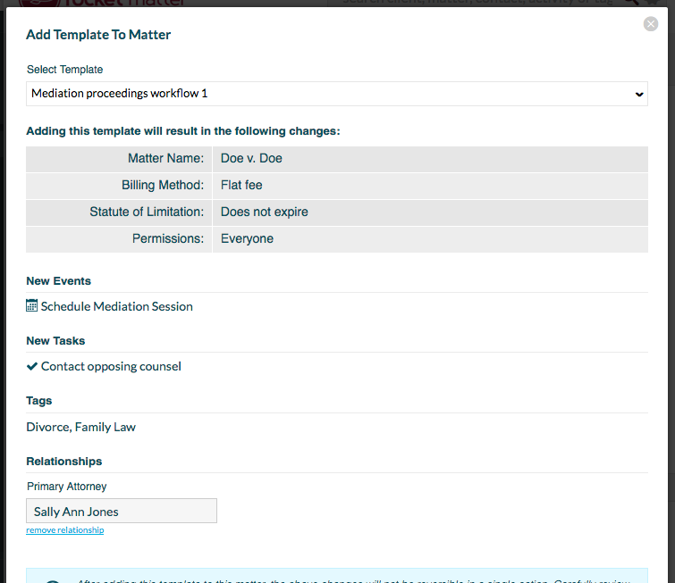 Before a Matter Template is applied to an existing Matter, you will be prompted by Rocket Matter to authorize whether or not you want to overwrite specific Matter descriptions, or override existing Matter settings. Once you approve the overwriting of descriptions, or the overriding of settings, you will not be able to revert to the previous data.