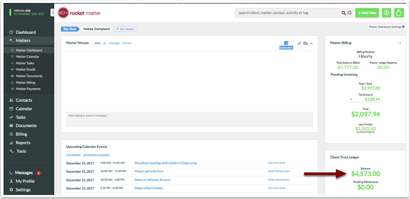 - Total amount in trust: This amount reflects the total amount of money being held in the trust account for this Client, regardless of how many Matters they have.
