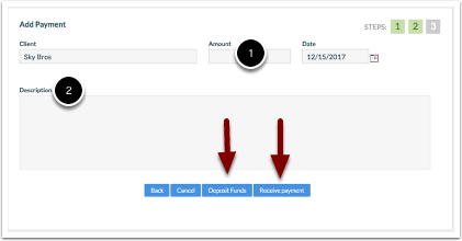 3. Enter the 'Amount' and 'Description'. Then, select either 'Deposit Funds' or 'Receive payment'.