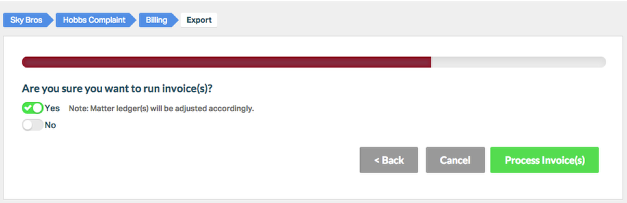 "Process Invoice(s)" will trigger the creation of your invoice. A debit will be created in your Matter Ledger, and a copy of your invoice will be stored in Matter Documents.