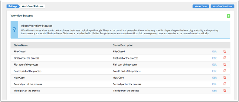 You can assign Matter Types to Matters for better organization and more accurate reporting. You can also build case statuses and status transitions to track case progress individually, and on a firm-wide level. Once you add a Matter Type, create some Workflow Statuses and build Workflow Transitions to outline a roadmap for how a particular Matter Type case type should progress.