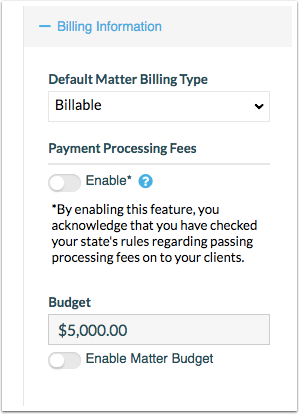 Due to specific client needs, certain Matters require a budget. Your firm may encounter times when a client is uneasy about moving forward with a case, due to budget concerns. The client may agree to a retainer, but is anxious about overspending and needs the ability to maintain the financial stamina to see a case all the way through.