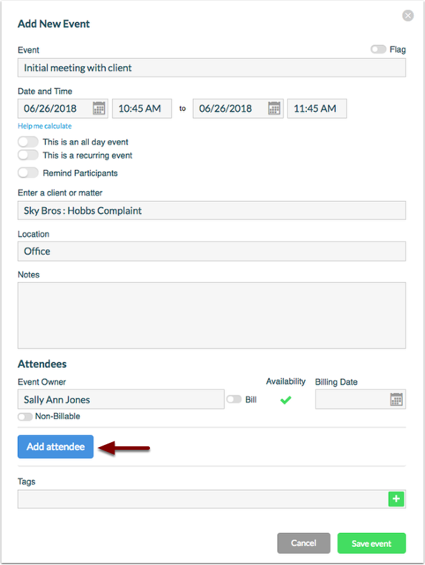 6. Enter the Contact or Client as an attendee. Select 'Add attendee' to add multiple attendees.