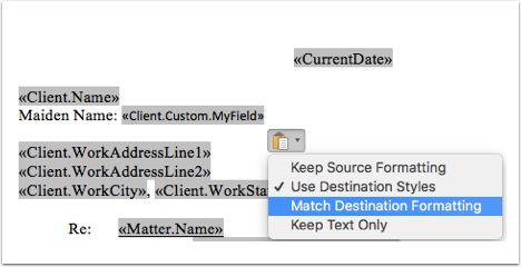 8. To keep the merge field code and match the existing font, click on the clipboard and select 'Match Destination Formatting'.